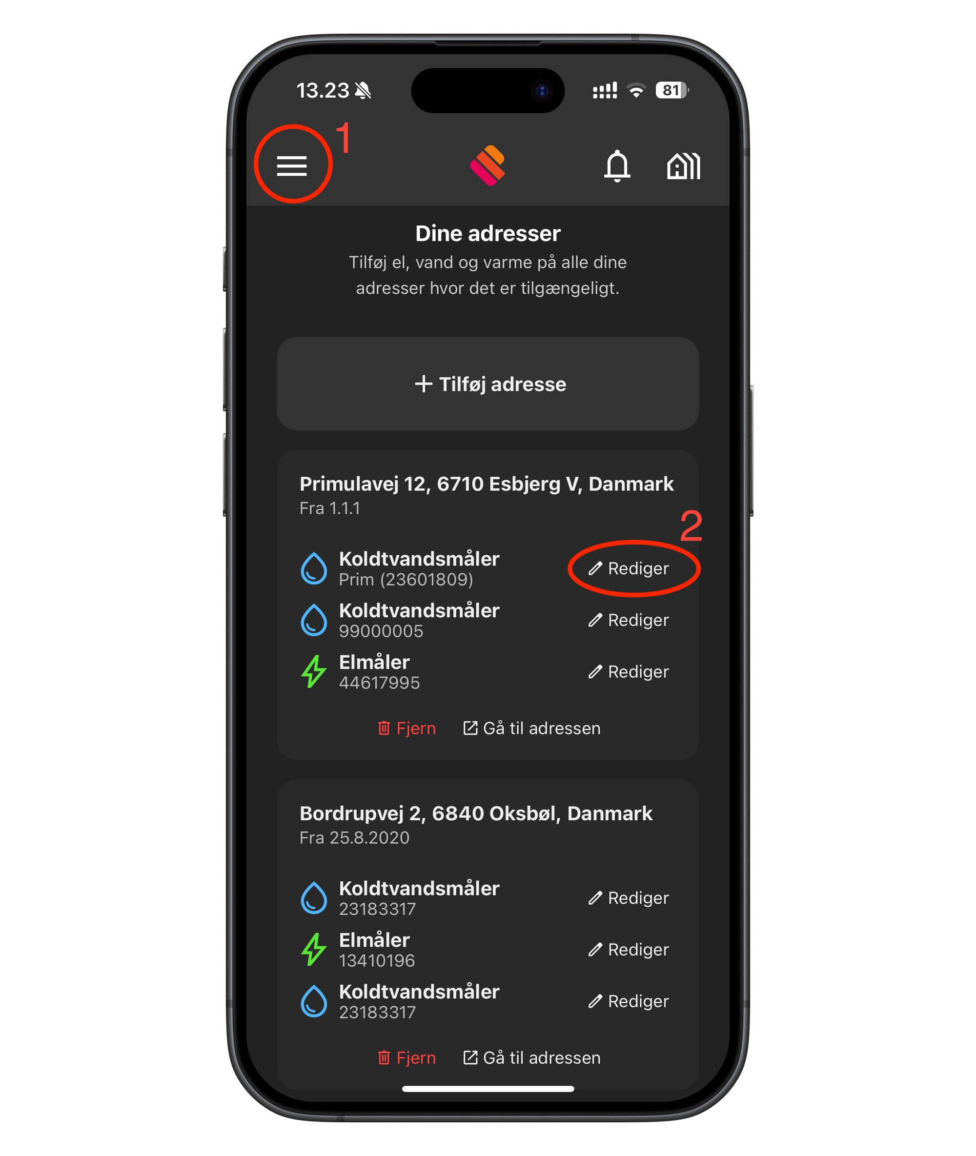 1. Tryk på de 3 streger i toppen, og vælg ”Dine adresser”