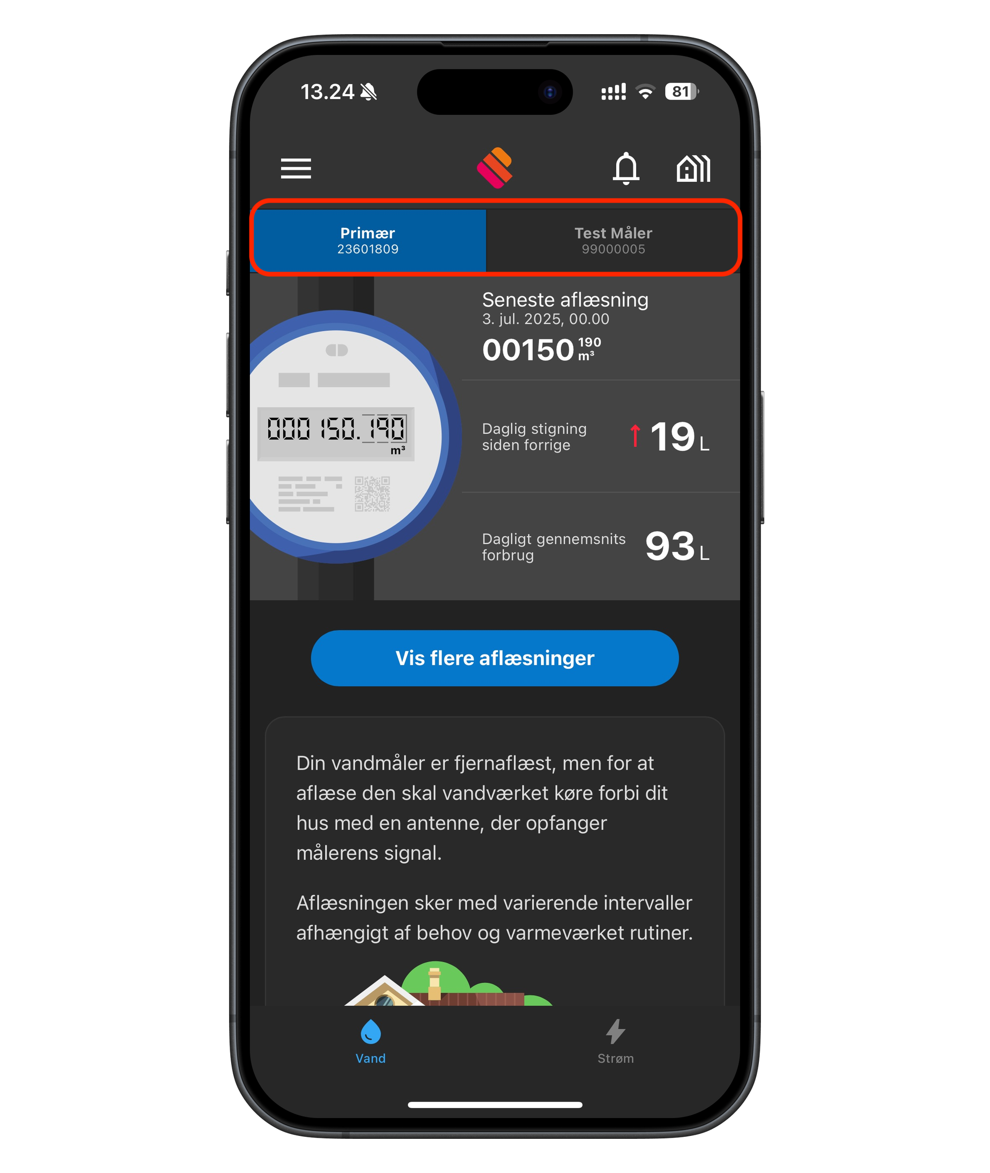 Nu ses navnet i toppen, eksempel ”Primær” til venstre, og en anden ”Test måler” til højre.
